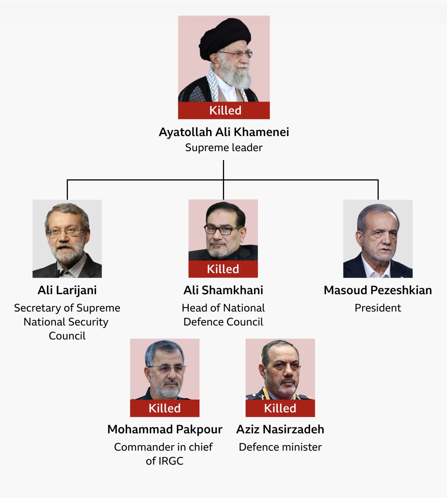 इस्लामिक क्रान्तिकारी गार्ड कोरका प्रमुख मोहम्मद पकपुर उच्चस्तरीय रक्षा बैठकमा सहभागी भइरहेका बेला आक्रमणमा मारिएको पुष्टि भएको बताइएको छ।